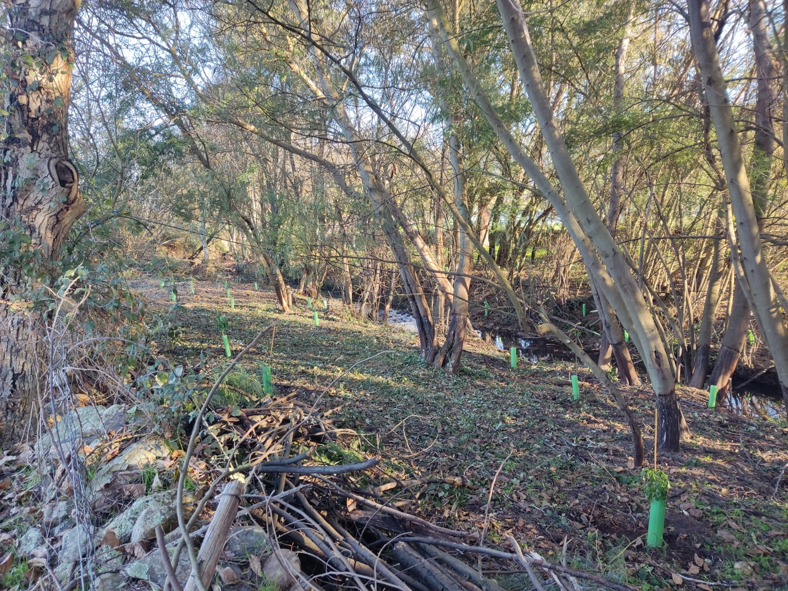 Para su restauración, se han llevado a cabo trabajos de descortezado de los ejemplares, seguidos de un periodo de espera para asegurar su secado, tras el cual se procedió a su tala controlada. Una vez eliminado el arbolado invasor, se inició la fase de recuperación mediante la plantación de especies de ribera autóctonas, entre ellas Alnus lusitanica (=A. glutinosa), Laurus nobilis, Lonicera periclymenum, Salix atrocinerea y Sambucus nigra.